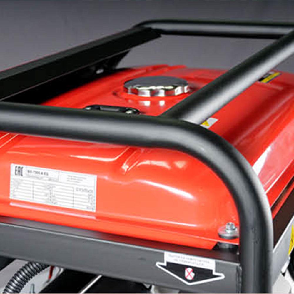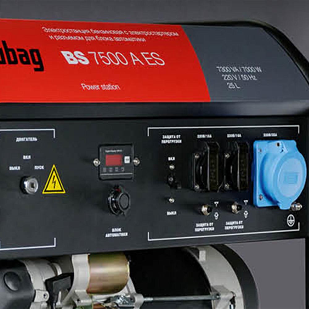 Панель управления оснащена тремя пыле/влагозащищенными розетками: двумя 220В/16А и одной 220В/32А для подключения мощных потребителей. Каждая розетка имеет индивидуальную защиту от короткого замыкания и перегрузки. Мультифункциональный цифровой дисплей позволяет контролировать выходное напряжение и частоту, а также отслеживать межсервисные интервалы. Счетчик моточасов вовремя напомнит о необходимости проведения технического обслуживания. Индикатор низкого уровня масла предупредит о критическом снижении его уровня, а датчик уровня масла автоматически отключит электростанцию, предотвращая повреждения двигателя. Мощная, толстостенная сварная рама диаметром 32 мм сохранит целостность конструкции даже в самых суровых условиях эксплуатации, защищая важные узлы от грязи и механических повреждений. Рама генератора Fubag BS 7500 A ES подготовлена для установки транспортировочного комплекта (колеса и ручки приобретаются отдельно).